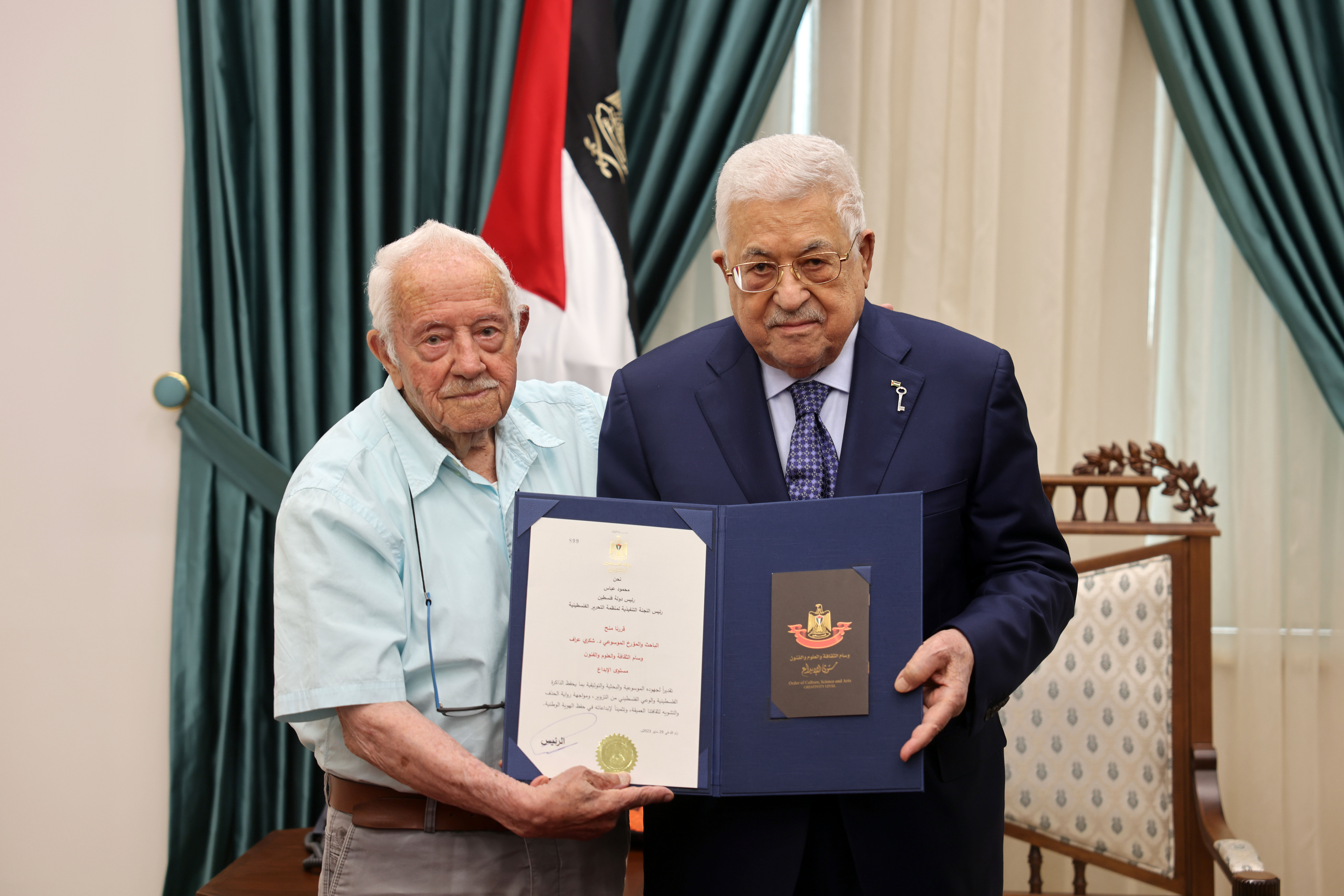 رام الله 31-5-2023 وفا- قلد رئيس دولة فلسطين محمود عباس، الباحث والمؤرخ الموسوعي شكري عراف، وسام الثقافة والعلوم "مستوى الابداع".