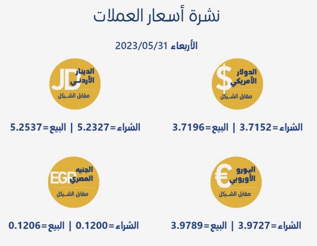 رام الله 31-5-2023 وفا- جاءت أسعار العملات مقابل الشيقل الإسرائيلي، اليوم الأربعاء، حسب سلطة النقد، على النحو التالي: