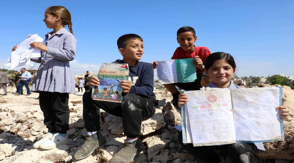 راح طلبة مدرسة التحدي "5" الأساسية المختلطة في منطقة "جب الذيب" في بيت تعمر، شرق بيت لحم، يبحثون عن كتبهم ودفاترهم وأقلامهم بين أنقاض مدرستهم التي دمرتها جرافات الاحتلال الإسرائيلي صباح اليوم.