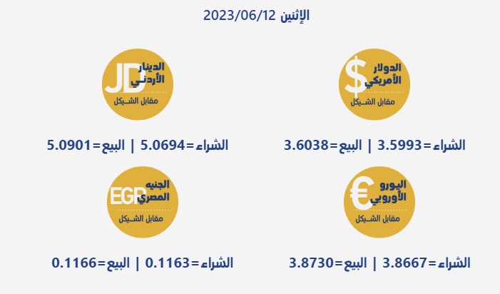 رام الله 12-6-2023 وفا- جاءت أسعار العملات مقابل الشيقل الإسرائيلي، اليوم الإثنين، حسب سلطة النقد، على النحو التالي: