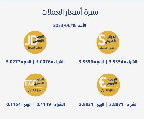 رام الله 18-6-2023 وفا- جاءت أسعار العملات مقابل الشيقل الإسرائيلي، اليوم الأحد، حسب سلطة النقد، على النحو التالي: