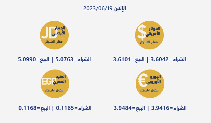 رام الله 19-6-2023 وفا- جاءت أسعار العملات مقابل الشيقل الإسرائيلي، اليوم الإثنين، حسب سلطة النقد، على النحو التالي: