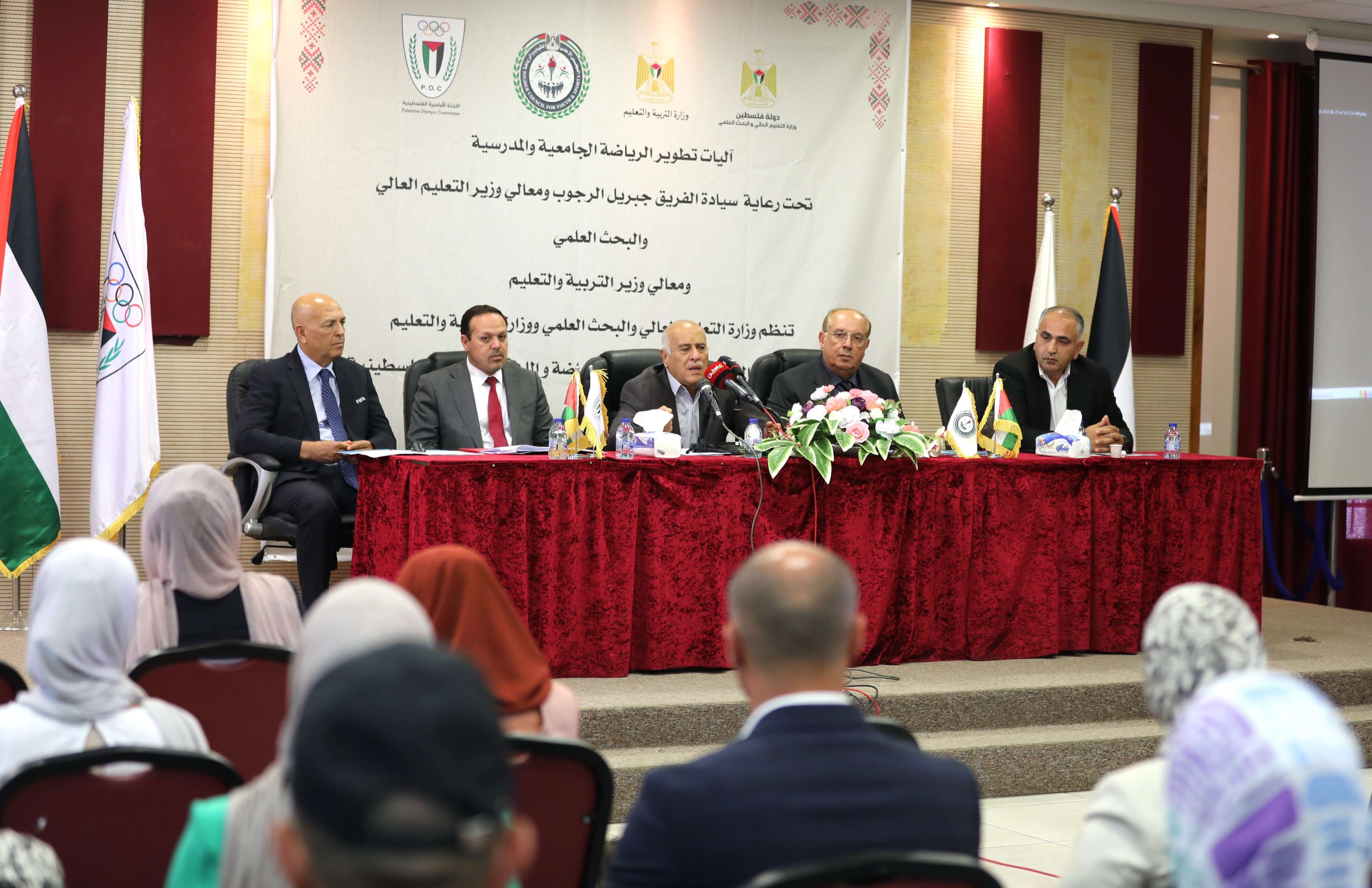 جاء ذلك بمشاركة رئيس المجلس الأعلى للشباب والرياضة، رئيس اللجنة الأولمبية الفريق جبريل الرجوب، ووزير التعليم العالي والبحث العلمي محمود أبو مويس، بحضور وكيل "التعليم العالي" بصري صالح، ووكيل التربية نافع عساف، وأمين عام اللجنة الأولمبية اللواء عبد المجيد حجة، وممثلين عن مؤسسات التعليم العالي ومديريات التربية والاتحادين الرياضيين الجامعي والمدرسي، وبعِرافةٍ من رئيس وحدة الإرشاد والتوجيه والشؤون الطلابية في "التعليم العالي" أيمن هودلي.
