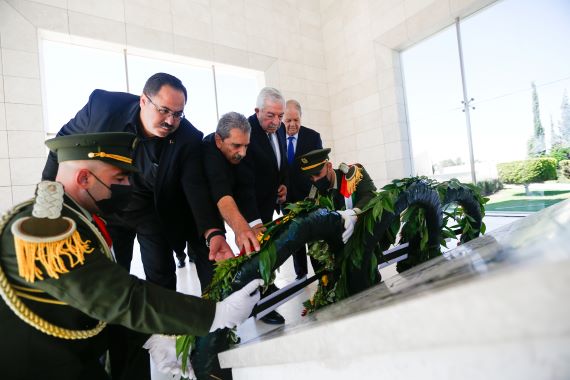 وقال: جئنا اليوم لنضع اكليل من الزهور على ضريح رمز هذه الأمة، ورمز هذه المسيرة النضالية الرائعة الشهيد ياسر عرفات.