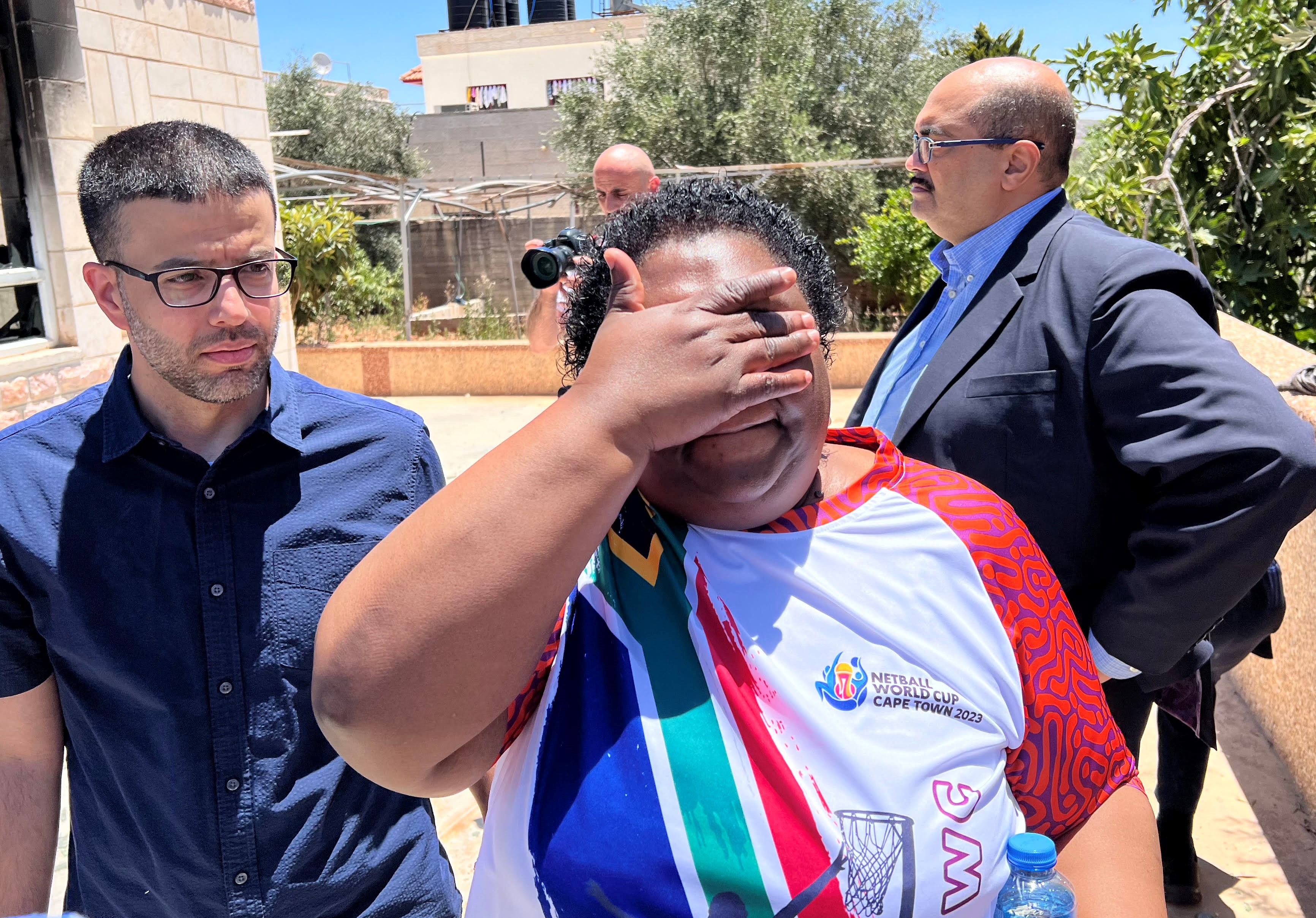رام الله 30-6-2023 وفا- بكت وزيرة الخدمة المدنية لجمهورية جنوب أفريقيا نوكسولو كيفيت، لدى معاينتها آثار الهجمات الإرهابية التي شنها المستوطنون قبل نحو عشرة أيام، على بلدة ترمسعيا شمال شرق رام الله.