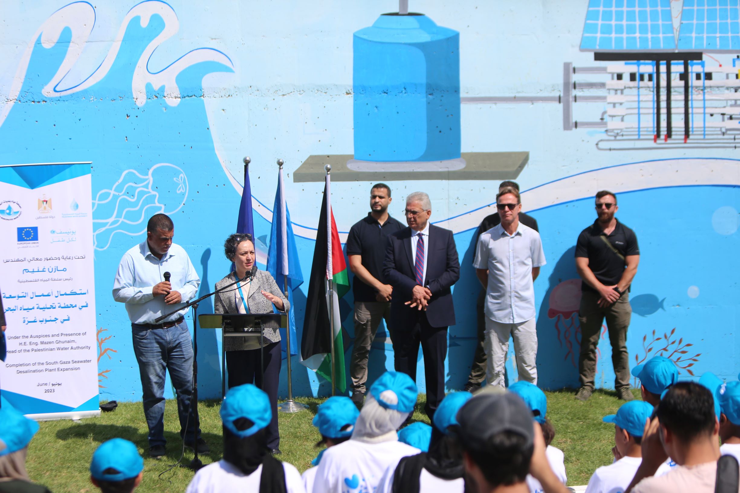 وقالت الممثلة الخاصة لليونيسف في دولة فلسطين، لوتشيا إلمي "إن محطة تحلية مياه البحر هذه تقدم مثالًا على كيفية تعاون السلطات الفلسطينية والمنظمات الدولية للمساعدة في تأمين حق الناس في الحصول على مياه آمنة. بفضل هذا التوسع، توفر المحطة مياهً آمنة للشرب والأغراض المنزلية لـ 250,000 شخص. كما وتساعد المحطة على إبطاء تدهور طبقة المياه الجوفية الساحلية عن طريق تقليل استخراج المياه الجوفية. فاليوم نحتفل بانتهاء رحلة مهمة قدناها بالتعاون مع الاتحاد الأوروبي وسلطة المياه الفلسطينية وممثلين عن مصلحة مياه بلديات الساحل."