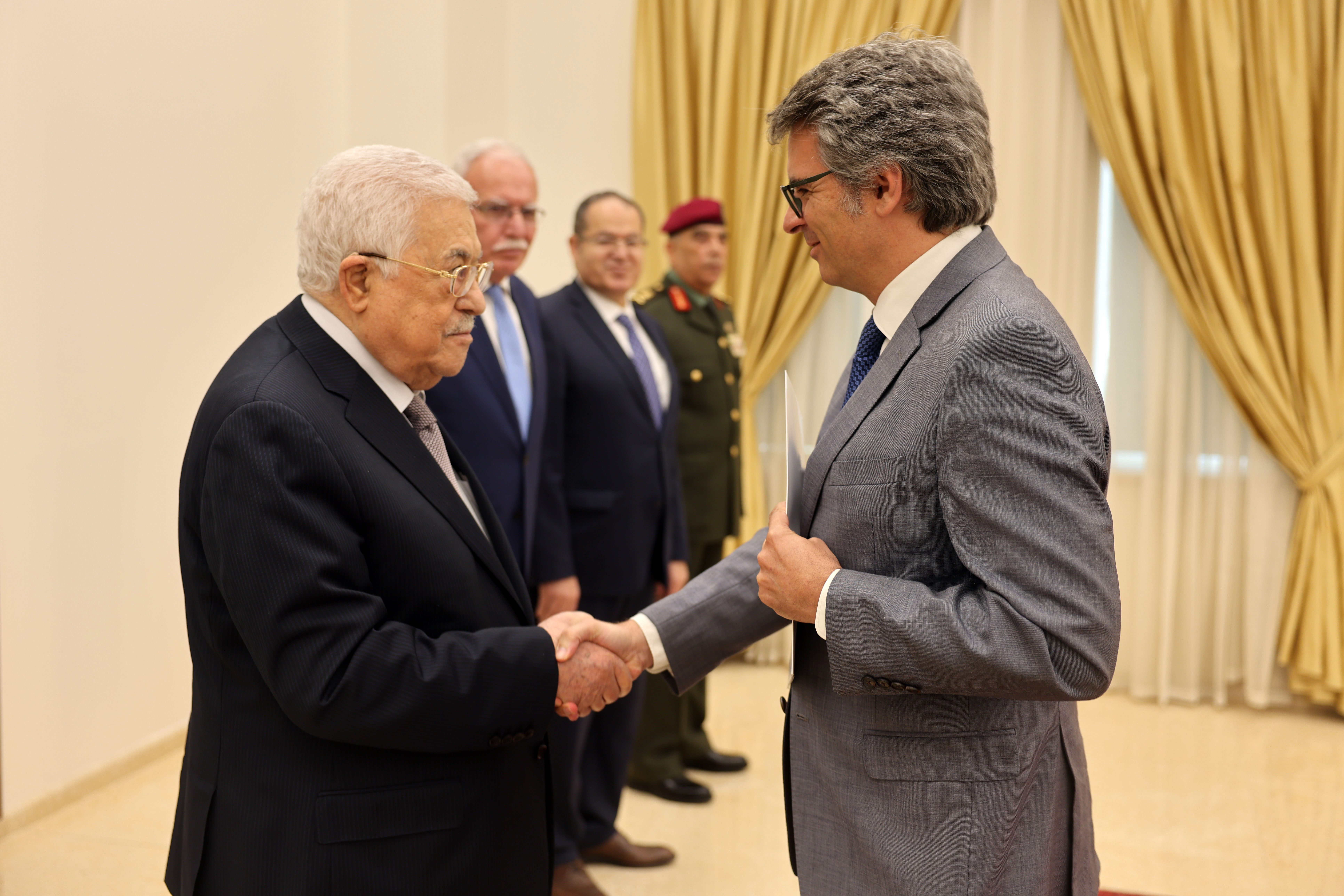 وحضر مراسم تقبل أوراق الاعتماد، وزير الخارجية والمغتربين رياض المالكي، ومستشار الرئيس للشؤون الدبلوماسية مجدي الخالدي، وقائد الحرس الرئاسي اللواء منير الزعبي.