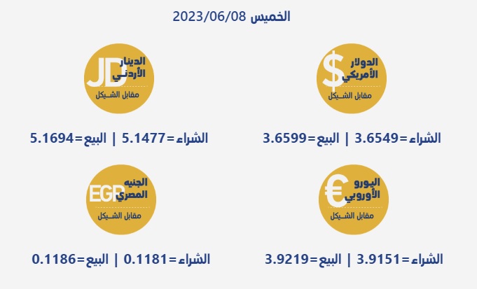 رام الله 8-6-2023 وفا- جاءت أسعار العملات مقابل الشيقل الإسرائيلي، اليوم الخميس، حسب سلطة النقد، على النحو التالي: