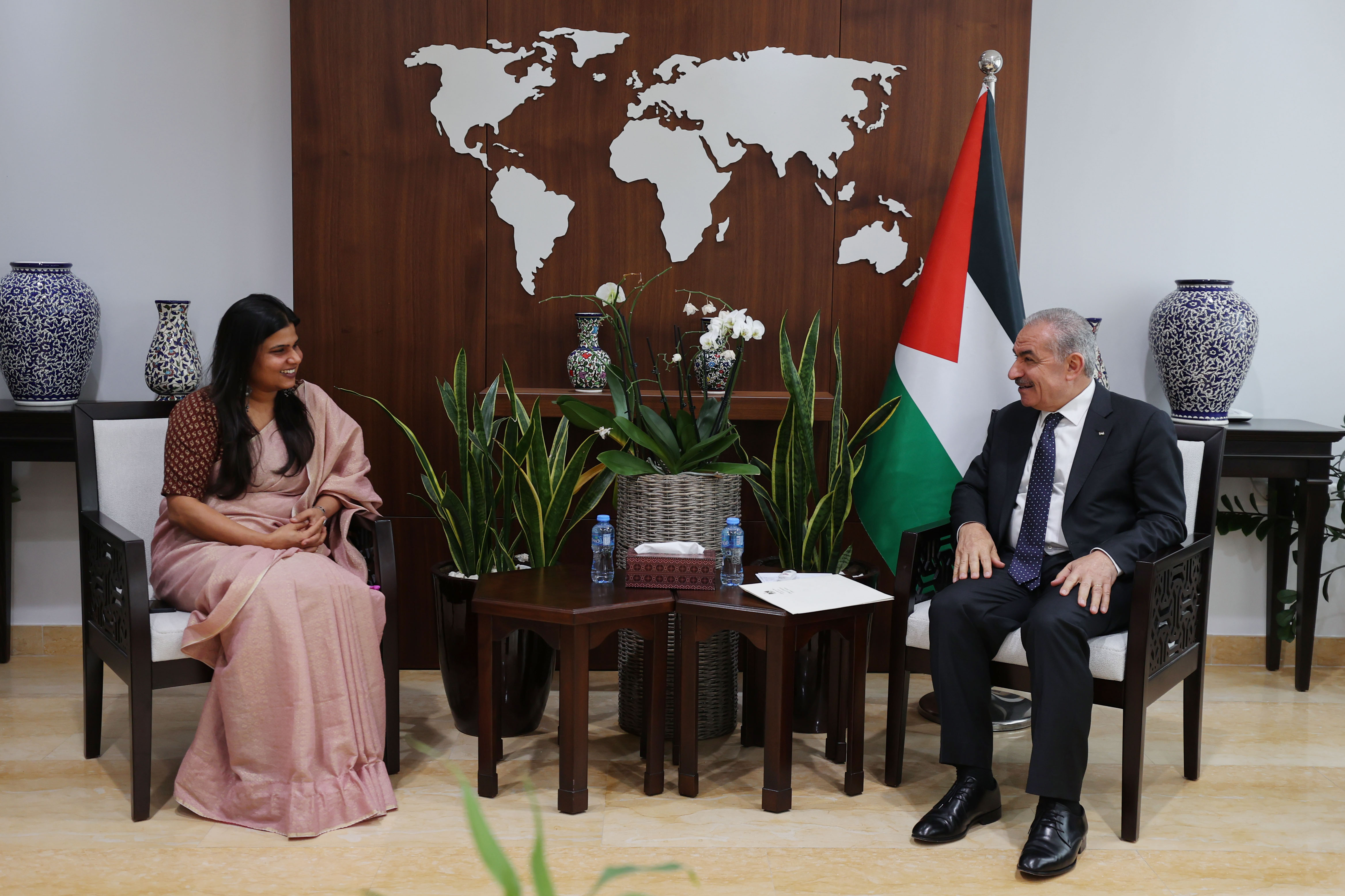 وبحث رئيس الوزراء مع ياداف مشاريع الهند في فلسطين، مثمنا الدعم الهندي المتواصل على جميع المستويات، متمنيا لها التوفيق في مهامها وتقديم جميع التسهيلات لعملها، بما يساهم في تعزيز العلاقات الثنائية بين البلدين.