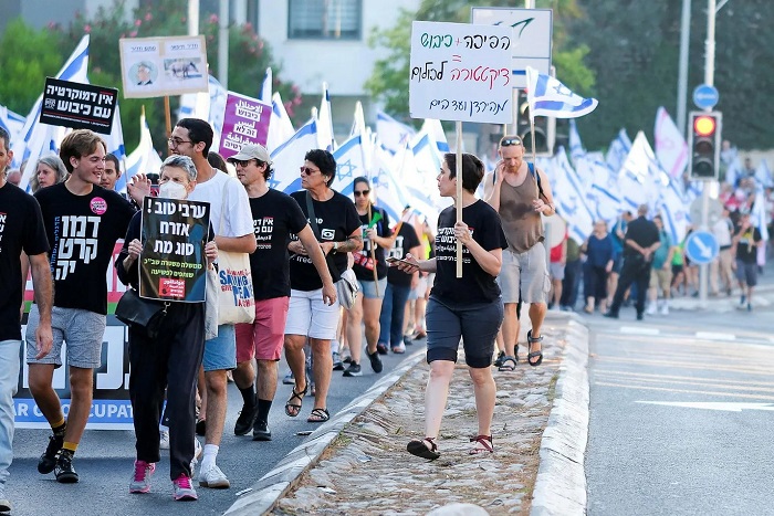 تل أبيب 15-7-2023 وفا- تجددت، مساء اليوم السبت، التظاهرات الاحتجاجية ضد حكومة بنيامين نتنياهو وخطتها لإضعاف جهاز القضاء، للأسبوع الثامن والعشرين على التوالي.