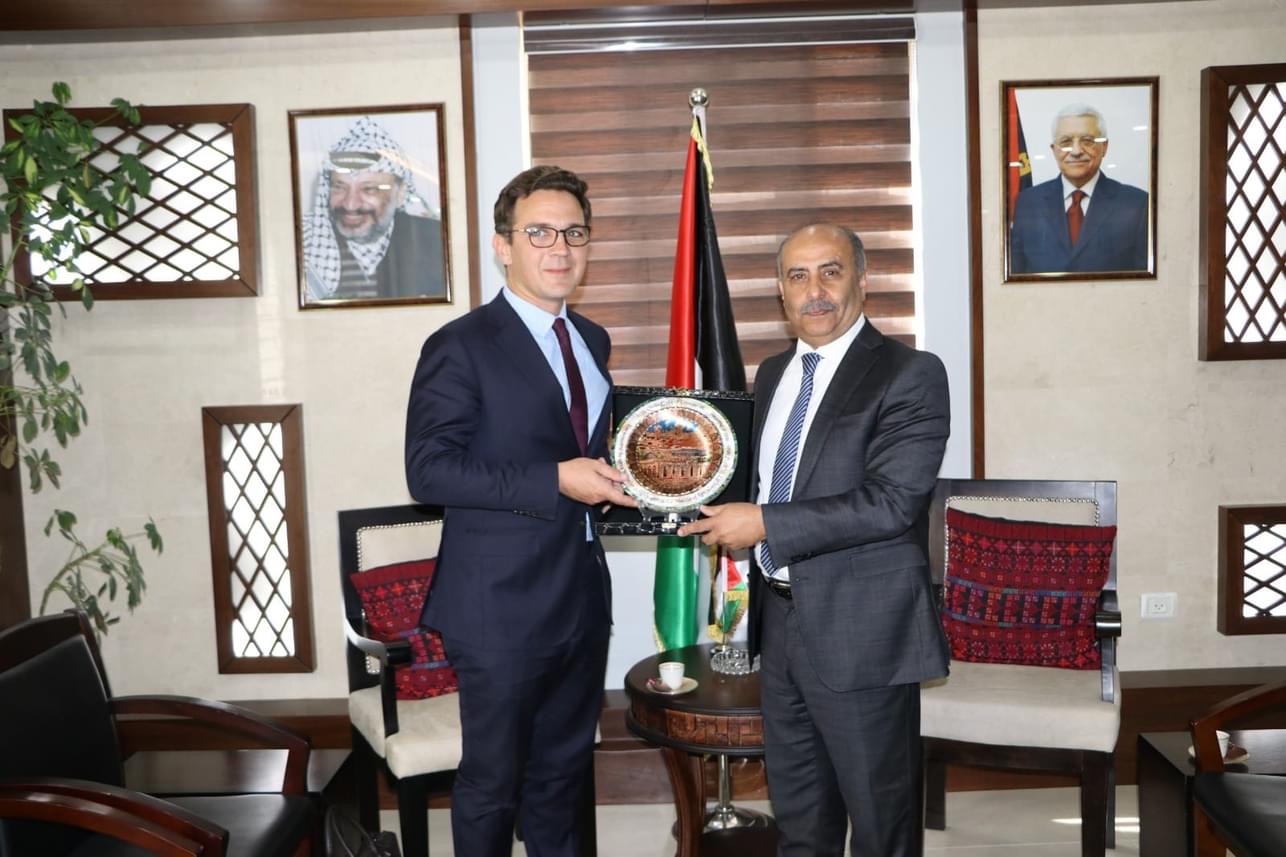 رام الله 17-7-2023 وفا- كرم وزير الزراعة رياض العطاري، اليوم الإثنين، رئيس قسم التنمية الاقتصادية والمياه والطاقة والتجارة والمنطقة "ج" في مكتب الاتحاد الأوروبي، شارلس رادووت دي شانتي، لمناسبة انتهاء عمله في فلسطين.
