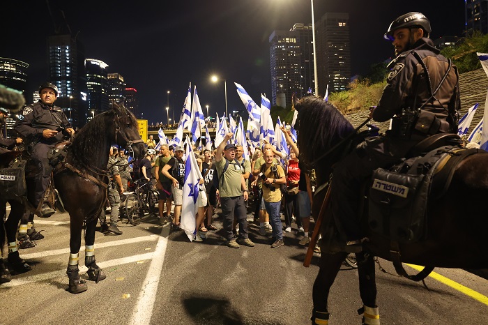 تل أبيب 18-7-2023 وفا- أغلق الآلاف من المتظاهرين، مساء اليوم الثلاثاء، شوارع مركزية وتقاطعات طرق رئيسية في تل أبيب وحيفا والخضيرة وبئر السبع وعدة مدن وبلدات، في إطار الاحتجاجات ضد حكومة بنيامين نتنياهو وخطتها لإضعاف جهاز القضاء.