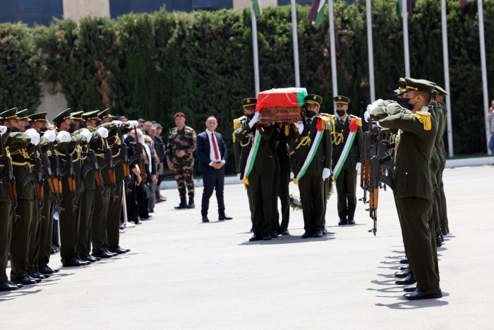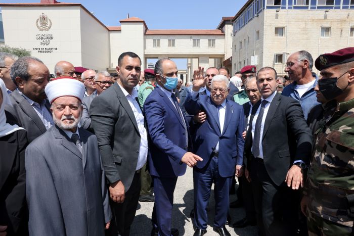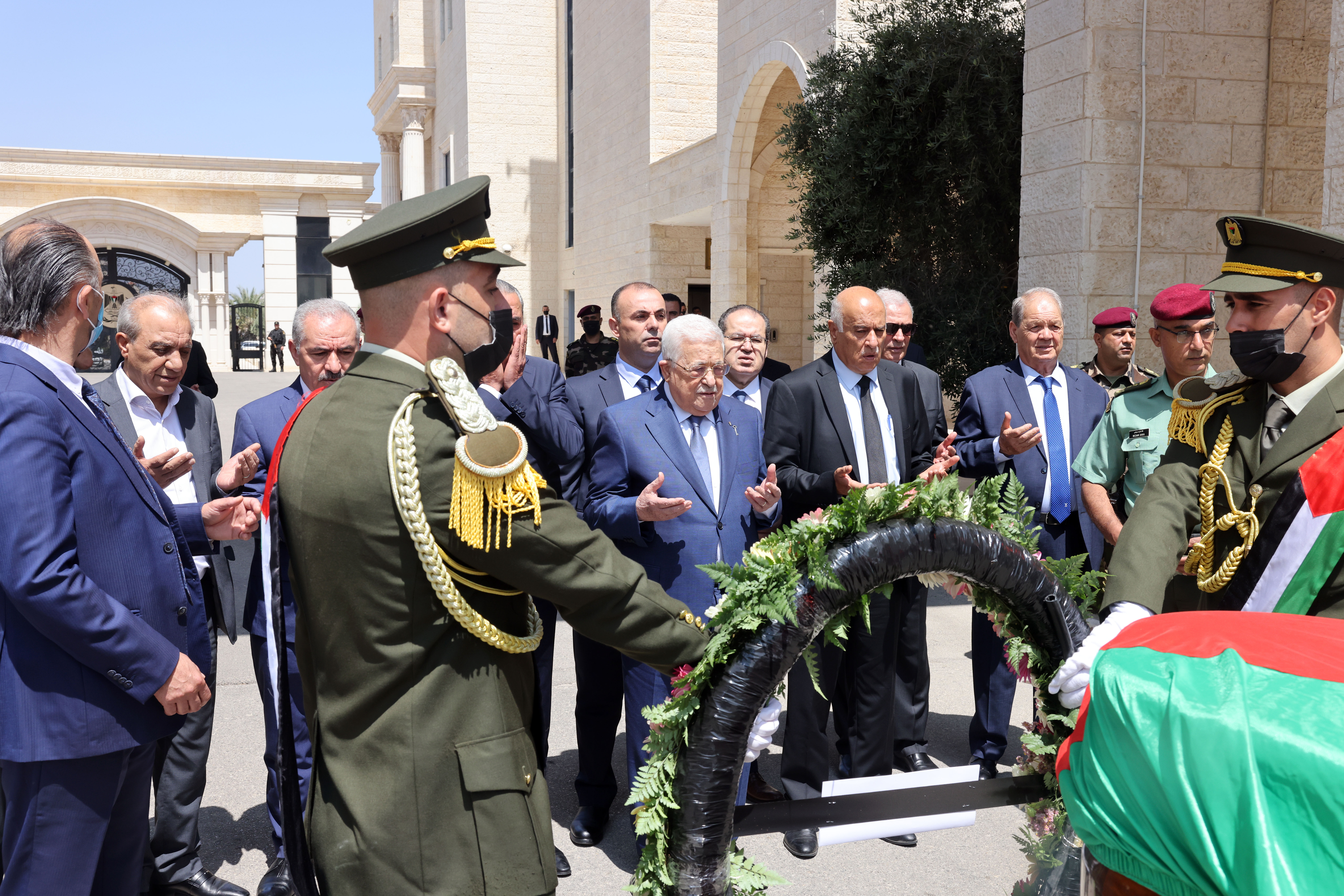 وألقى الرئيس عباس، نظرة الوداع الأخيرة على جثمان المناضل الوطني قدري أبو بكر، ووضع على نعشه إكليلا من الزهور.
