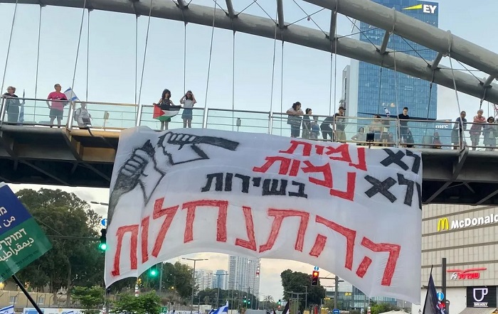 وعلّقت مجموعة من النشطاء الشباب المناهضين للاحتلال الإسرائيلي، لافتة فوق جسر بالقرب من تظاهرة تل أبيب الرئيسية، كتب عليها "لم نموت ولن نموت في الخدمة في المستوطنات".