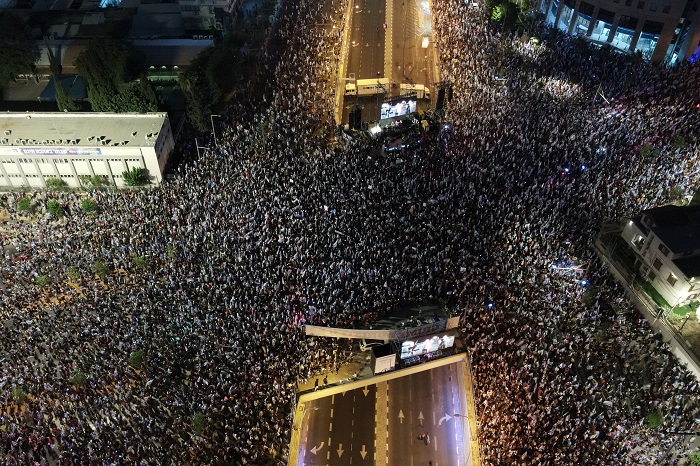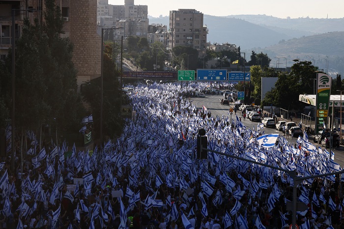 تل أبيب 22-7-2023 وفا- وصل عشرات الآلاف من الإسرائيليين، مساء اليوم السبت، إلى أمام مقر "الكنيست" الإسرائيلية في القدس، في تظاهرة انطلقت من تل أبيب يوم الثلاثاء الماضي، احتجاجا على حكومة بنيامين نتنياهو وخطتها لإضعاف "جهاز القضاء".