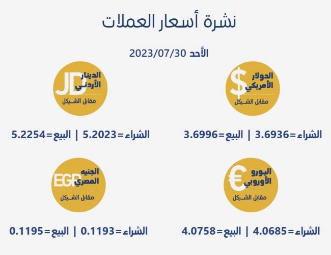 رام الله 30-7-2023 وفا- جاءت أسعار العملات مقابل الشيقل الإسرائيلي، اليوم الأحد، حسب سلطة النقد، على النحو التالي: