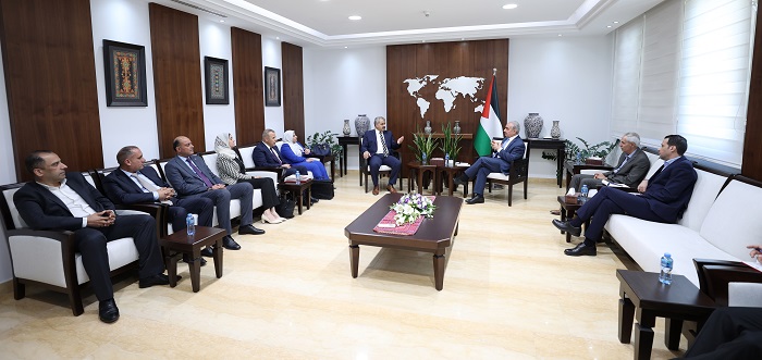 رام الله 10-8-2023 وفا- تسلم رئيس الوزراء محمد اشتية، اليوم الخميس، في مكتبه برام الله، التقرير السنوي الصادر عن ديوان الرقابة المالية والإدارية لعام 2022، من رئيس الديوان إياد تيم.