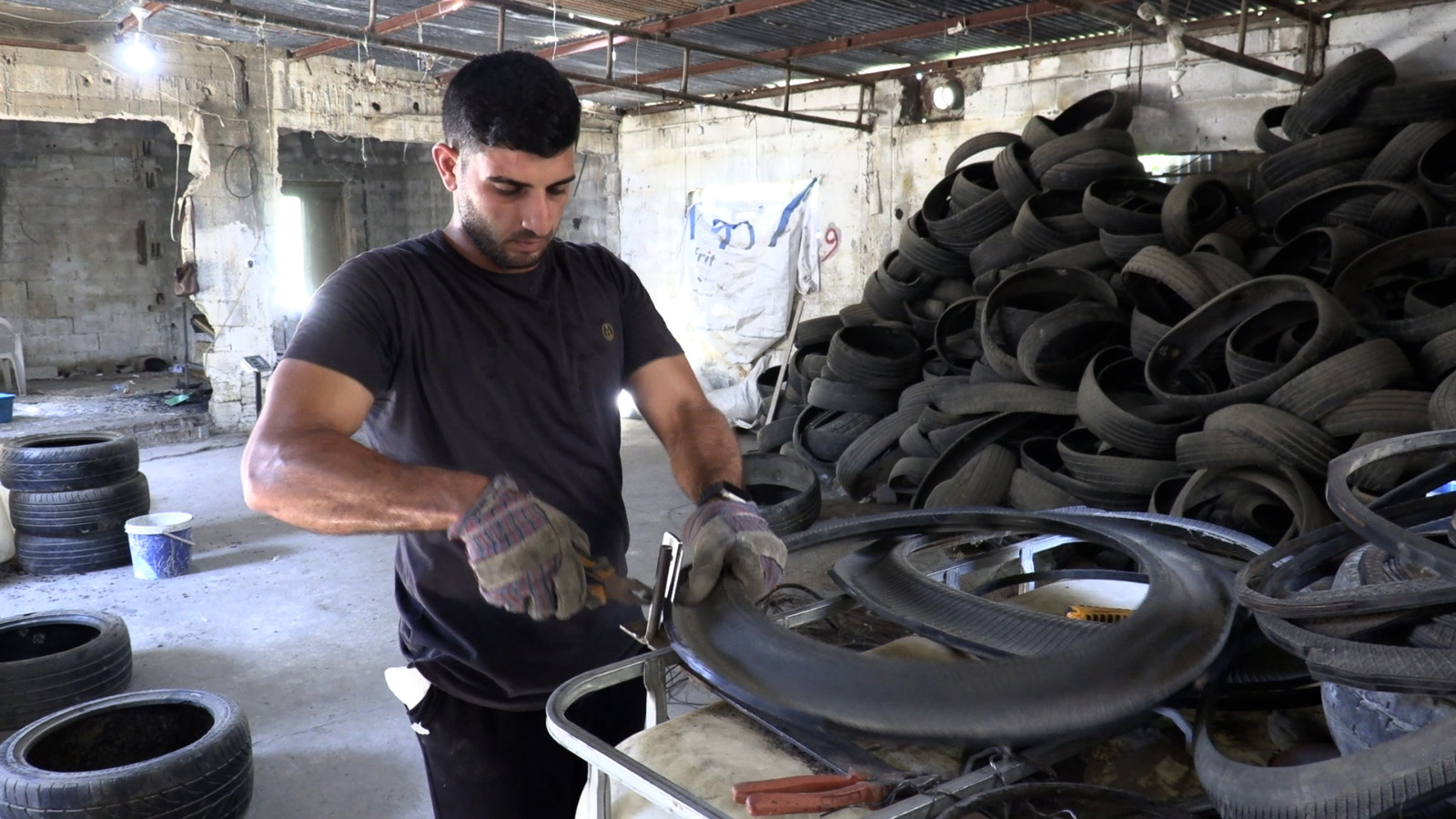 في ضوء انتشار آفة الإطارات المطاطية التالفة وعدم التخلص منها بطرق آمنة وسليمة وآثارها على المجتمع والبيئة، يقوم الشاب مدين حلس (27 عاما) بإعادة تدوير الإطارات إلى مواد صديقة للبيئة، للتخفيف من أضرارها على قطاع غزة.