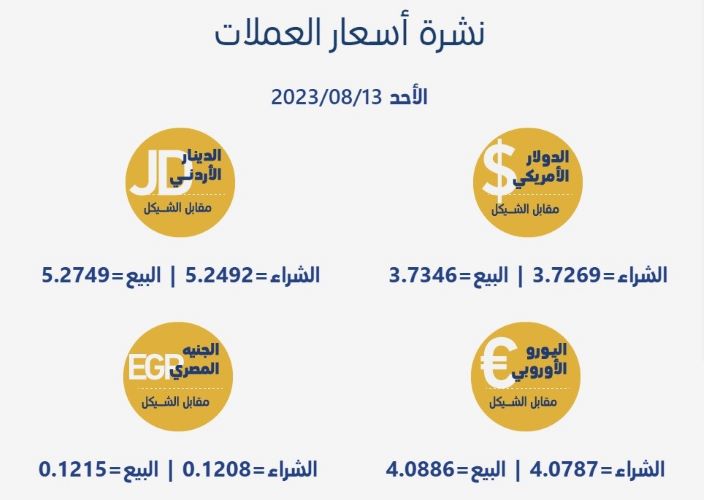 رام الله 13-8-2023 وفا- جاءت أسعار العملات مقابل الشيقل الإسرائيلي، اليوم الأحد، حسب سلطة النقد، على النحو التالي: