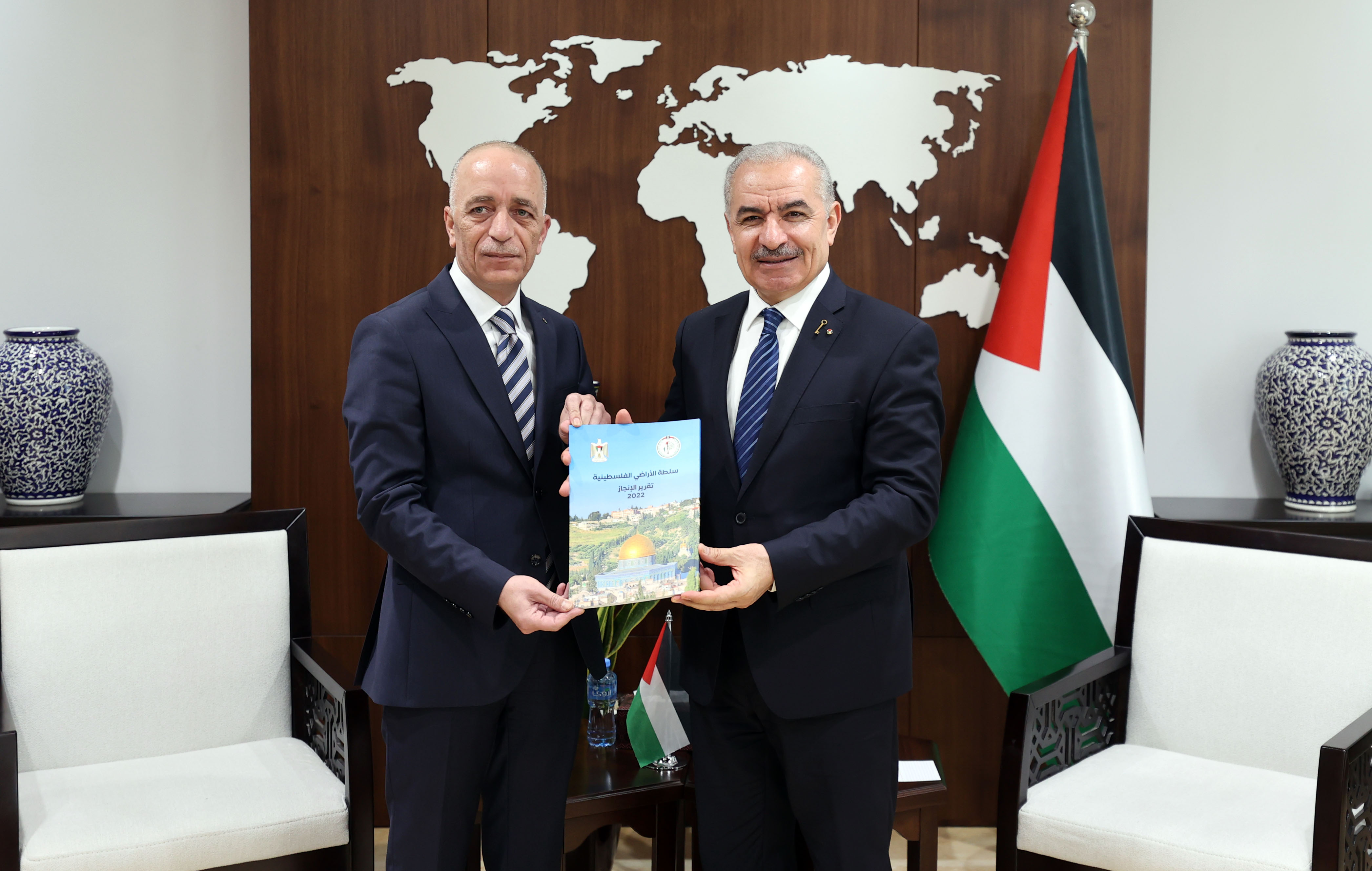 رام الله 15-8-2023 وفا- تسلّم رئيس الوزراء محمد اشتية، اليوم الثلاثاء في مكتبه برام الله، التقرير السنوي لسلطة الأراضي للعام 2022، من رئيس سلطة الأراضي علاء التميمي.