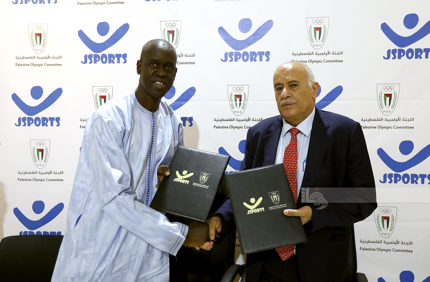 القدس 15-8-2023 وفا- وقع رئيس المجلس الأعلى للشباب والرياضة، رئيس اللجنة الأولمبية الفريق جبريل الرجوب اليوم الثلاثاء، مع رئيس مجلس إدارة شركة "جيه سبورتس" السنغالية جميل فايي، اتفاقية رعاية تزود بموجبها الشركة السنغالية ملابس للبعثات الرياضية الفلسطينية حتى عام 2026.
