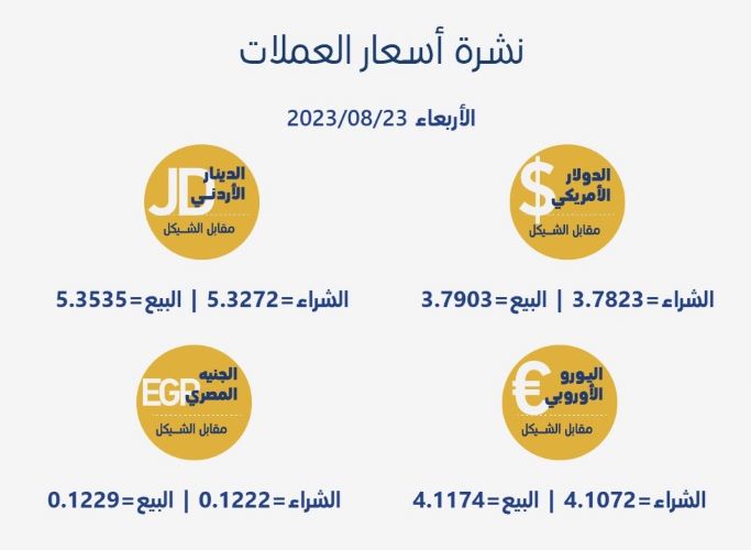 رام الله 23-8-2023 وفا- جاءت أسعار العملات مقابل الشيقل الإسرائيلي، اليوم الأربعاء، حسب سلطة النقد، على النحو التالي: