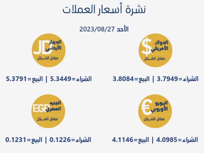 رام الله 27-8-2023 وفا- جاءت أسعار العملات مقابل الشيقل الإسرائيلي، اليوم الأحد، حسب سلطة النقد، على النحو التالي: