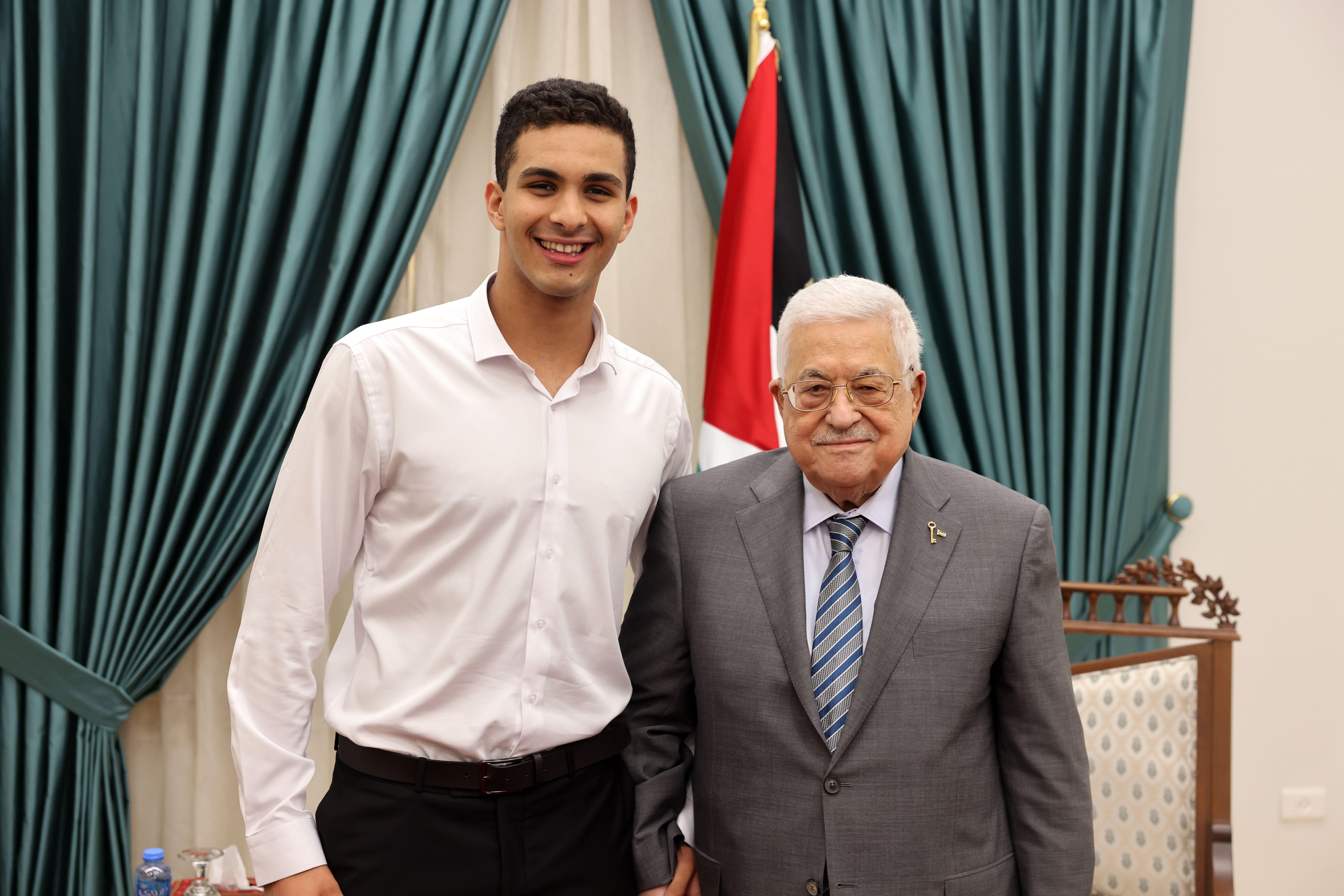 رام الله 7-8-2023 وفا- استقبل رئيس دولة فلسطين محمود عباس، اليوم الاثنين، السبّاح يزن البوّاب الحاصل على ميداليتين ذهبيتين في دورة الألعاب العربية التي اقيمت مؤخرا في الجزائر