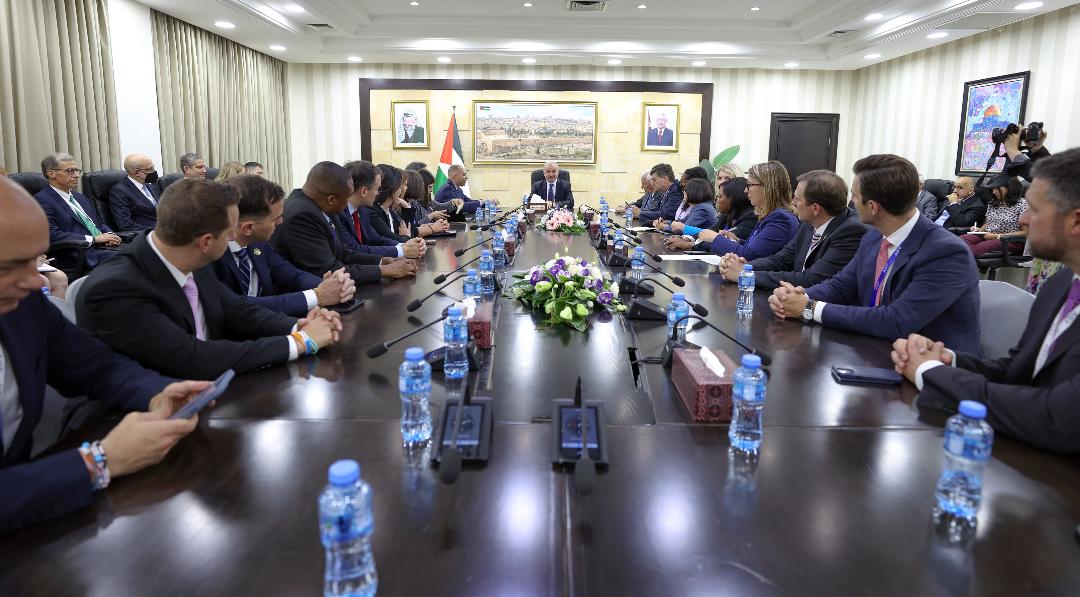 رام الله 7-8-2023 وفا- التقى رئيس الوزراء محمد اشتية، اليوم الاثنين، في مكتبه برام الله، وفدا من أعضاء الكونغرس الأميركي ضم 22 عضوًا من الحزب الديمقراطي، برئاسة السيناتور حكيم جيفريز، زعيم كتلة الديمقراطيين في مجلس النواب.