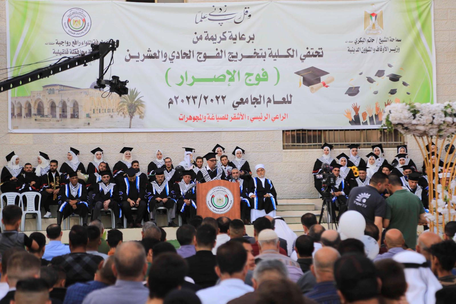 قلقيلية 7-8-2023 وفا- نظمت كلية العلوم والدراسات الإسلامية التابعة لوزارة الأوقاف والشؤون الدينية اليوم الاثنين، برعاية محافظ قلقيلية اللواء رافع رواجبة، ووزير الاوقاف والشؤون الدينية الشيخ حاتم البكري، حفل تخريج الفوج الحادي والعشرين "فوج الإصرار" للعام الدراسي 2022-2023 وذلك في مبنى الكلية في مدينة قلقيلية.