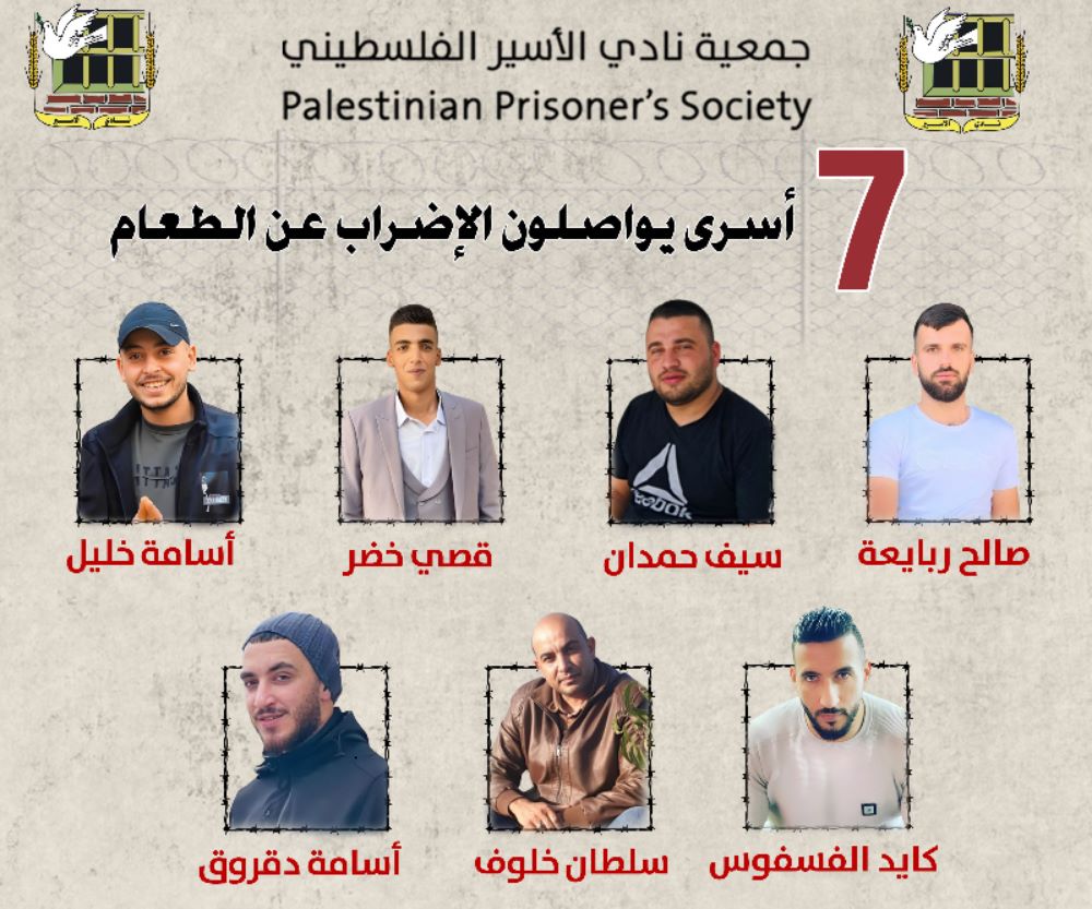 ويواصل الأسرى: سيف حمدان (29 عاما)، وصالح ربايعة (22 عاما)، وقصي خضر (25 عاما)، وأسامة خليل (23 عاما)، إضرابهم عن الطعام منذ 11 يوما. كما يواصل الأسيران كايد الفسفوس (34 عاما) وسلطان خلوف (42 عاما) إضرابهما منذ سبعة أيام.