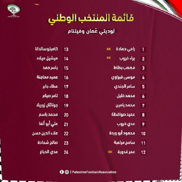 وضمت القائمة 24 لاعبا، حيث شهدت تواجد وجوه جديدة تشارك للمرة الأولى مع "الفدائي"، وهم: كاميلو سالدانا، عميد محاجنة، علي أبو ألفا، وعلاء الدين حسن. كما عاد إلى قائمة المنتخب الوطني، مصعب البطاط، وسامح مراعبة، وعدي الدباغ، فيما يغيب محمد صالح ومحمود وادي.