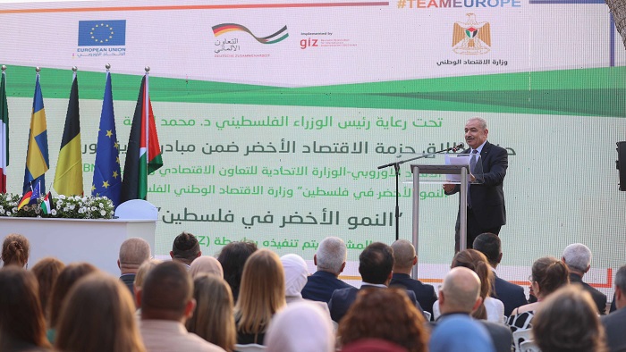 رام الله 13-9-2023 وفا- أطلق برام الله، اليوم الأربعاء، مشروع "الاقتصاد الأخضر في فلسطين"، بتمويل أوروبي بإجمالي 55.5 مليون يورو، بحضور رئيس الوزراء محمد اشتية، ووزير الاقتصاد خالد عسيلي، وممثل الاتحاد الأوروبي الكسندر ستوتزمان، وممثل ألمانيا لدى فلسطين اوليفر اوفتشا، وعدد من الدبلوماسيين وممثلي مؤسسات أوروبية.