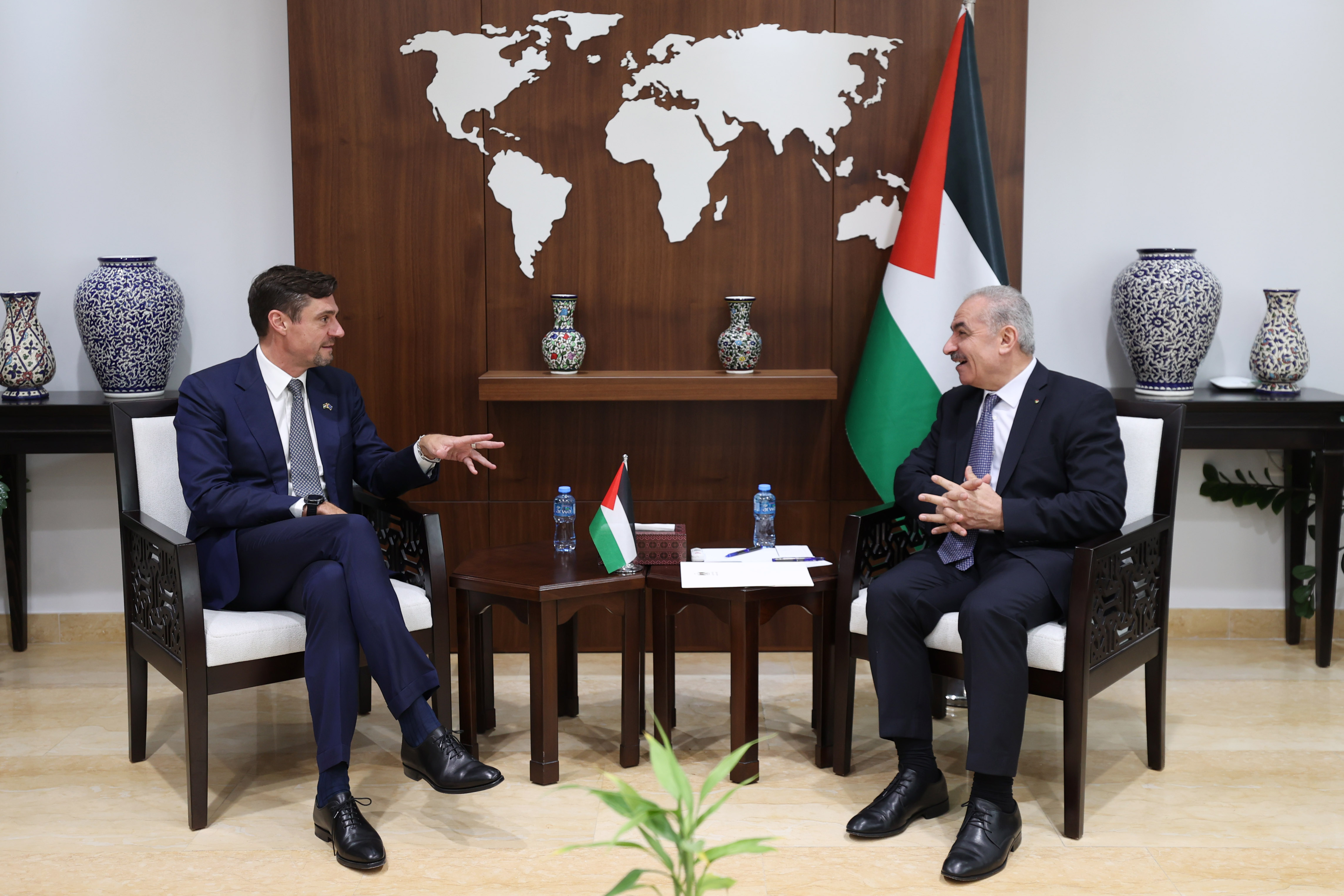 رام الله 13-9-2023 وفا- استقبل رئيس الوزراء محمد اشتية اليوم الأربعاء في مكتبه برام الله، ممثل الاتحاد الأوروبي الجديد لدى دولة فلسطين ألكسندر ستوتزمان.