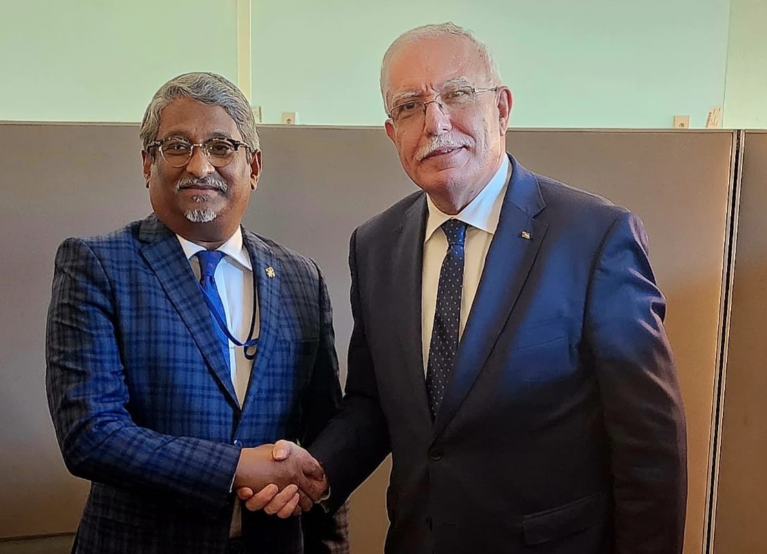 نيويورك 21-9-2023 وفا- التقى وزير الخارجية والمغتربين رياض المالكي، اليوم الخميس، وزير الدولة للشؤون الخارجية لجمهورية المالديف أحمد خليل، وذلك على هامش اجتماعات الجمعية العامة للأمم المتحدة في نيويورك.