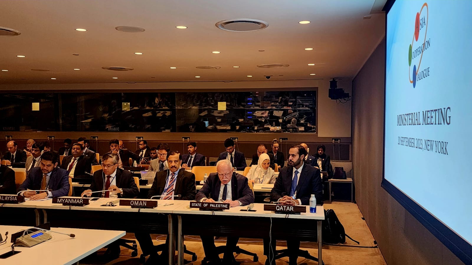 نيويورك 21-9-2023 وفا- شاركت دولة فلسطين في الاجتماع الـ18 لوزراء خارجية الدول الأعضاء في حوار التعاون الآسيوي، الذي عُقد في نيويورك على هامش أعمال الدورة الـ78 للجمعية العامة للأمم المتحدة، بعنوان: "التعافي المستدام ما بعد الجائحة".
