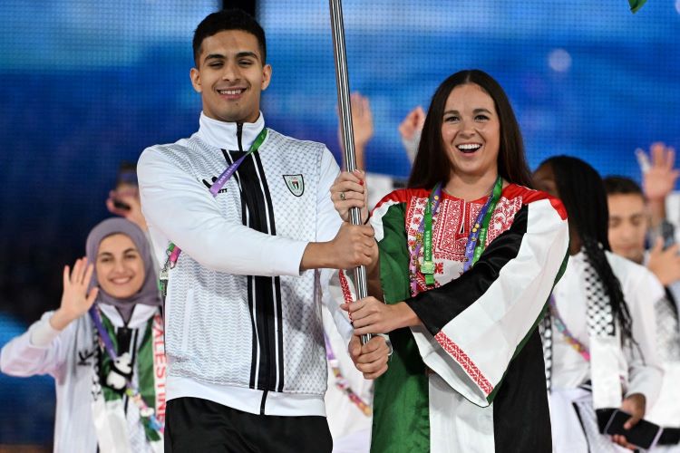 ورفع لاعبا منتخبنا الوطني للسباحة، فاليري ترزي ويزن البواب، علم دولة فلسطين، في حفل افتتاح دورة الألعاب الآسيوية الـ19.