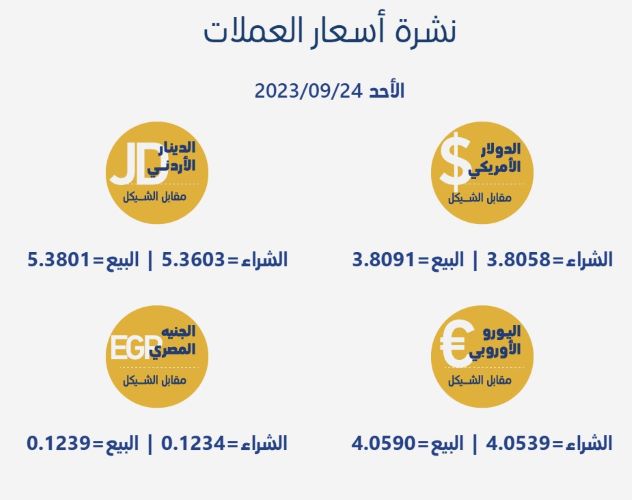 رام الله 24-9-2023 وفا- جاءت أسعار العملات مقابل الشيقل الإسرائيلي، اليوم الأحد، حسب سلطة النقد، على النحو التالي: