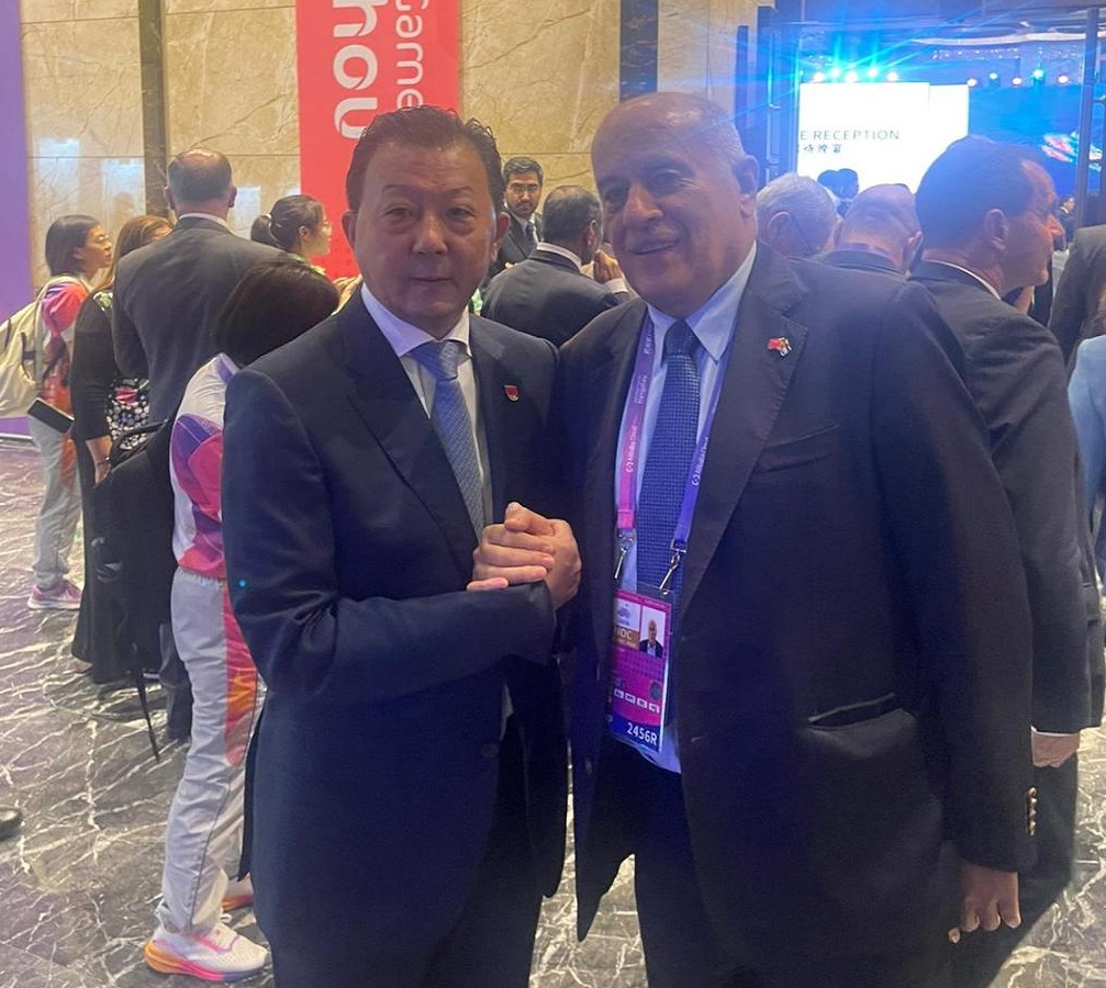 هانغجو (الصين) 25-9-2023 وفا- التقى رئيس المجلس الأعلى للشباب والرياضة الفريق جبريل الرجوب، اليوم الإثنين، نائب وزير الشباب والرياضة الصيني، نائب رئيس اللجنة الأولمبية لي ينج تشوان.