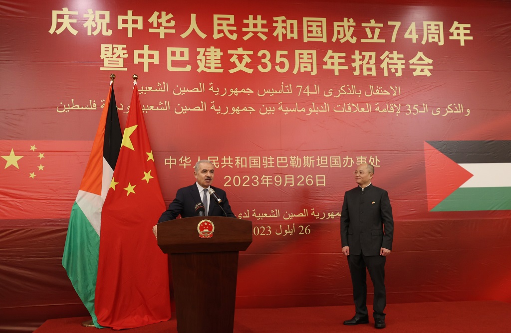 وأضاف اشتية: "باسم السيد الرئيس محمود عباس والحكومة وشعبنا والحاضرين، نتقدم لجمهورية الصين الشعبية قيادة وحكومة وشعبًا، بالتهنئة في هذا اليوم المتميز الذي تحتفل فيه الصين باليوم الوطني، ذكرى ثورة أكتوبر، 74 عاما على تأسيس جمهورية الصين الشعبية".