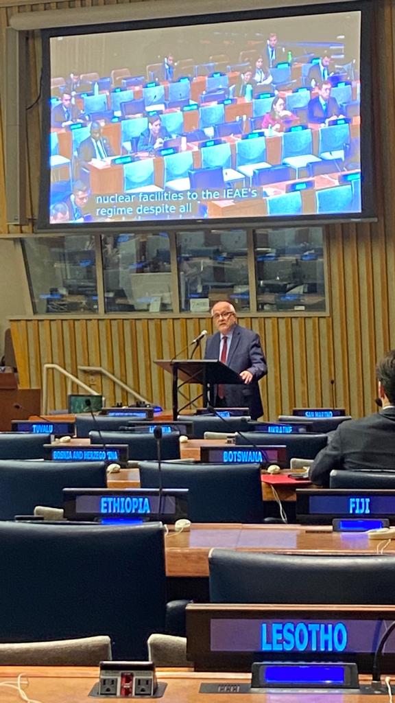 نيويورك 27-9-2023 وفا- مثّل المندوب الدائم لدولة فلسطين لدى الأمم المتحدة رياض منصور، دولة فلسطين في الاجتماع رفيع المستوى للجمعية العامة للأمم المتحدة، لمناسبة اليوم العالمي للتخلص التّام من الأسلحة النووية.
