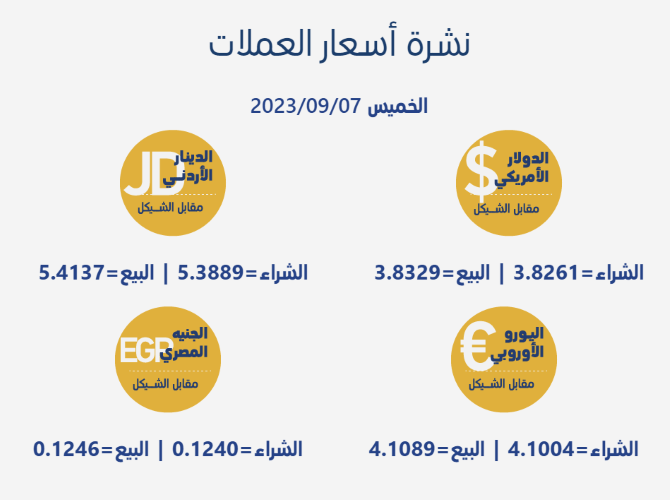 رام الله 7-9-2023 وفا- جاءت أسعار العملات مقابل الشيقل الإسرائيلي، اليوم الخميس، حسب سلطة النقد، على النحو التالي: