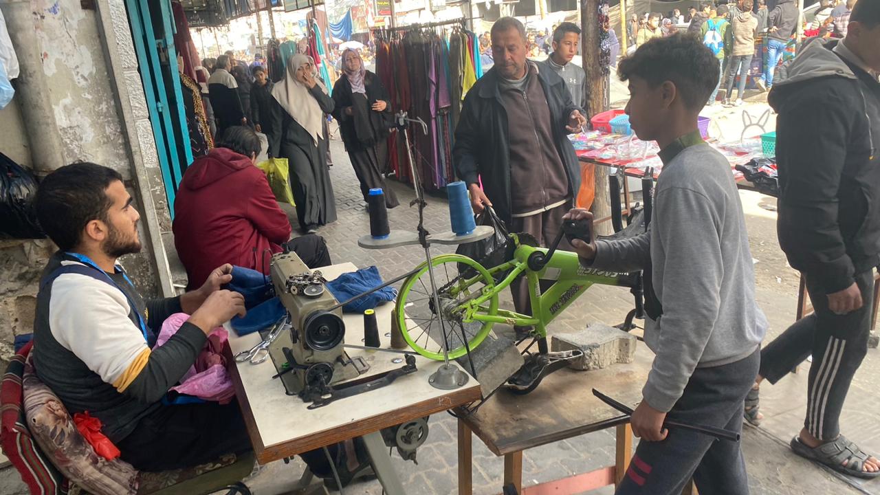 شبان وفتية على قارعة الطريق يبيعون مأكولات وحلويات منزلية الصنع، الفستقية والمهلبية والسمسمية والمعجنات. بلال عبد الهادي قال، إنه مختص في التسويق الالكتروني وخدمات توزيع الانترنت في غزة، نزح قسرا لرفح ويقيم في منزل أحد الأقارب. "فقدت عملي بغزة ولا مصدر دخل لي ولن أكون عالة على من يستضيفونني"، قال عبد الهادي.