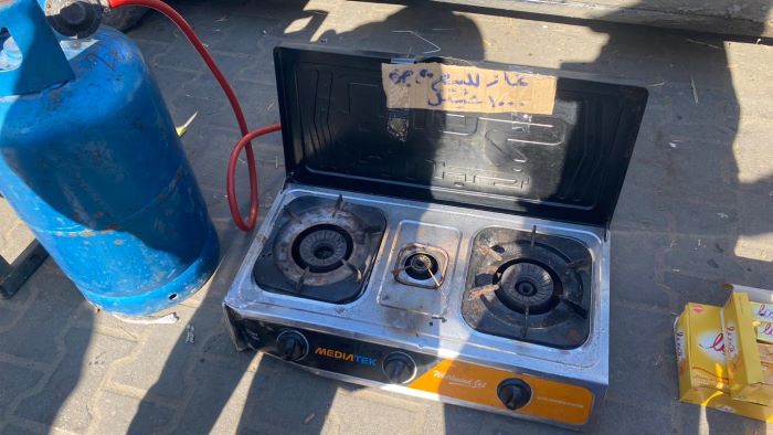 طابور أمام بائع العوامة، وطابور عند موزع غاز الطبخ، بجانبه رجل عرض أنبوبة غاز مستعملة مع فرش بوتاغاز مستعمل بمبلغ 1000 شيقل.