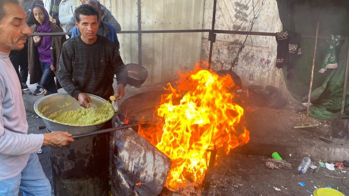 طوابير في كل اتجاه، مخبز نادر يعمل أمامه طابور بالمئات، ومئات أخرى في كومة على باب المخبز. وطابور على نقطة بيع مياه، انقسم نصفين نصف للرجال وآخر للنساء لتعبئة غالون ماء مجاني وآخر بشيقلين لكل غالون. يحمل الأطفال الغالون على عجلات صغيرة وكراسي متحركة لكهل توفى أو مريض حي، وسط وحل مياه المجاري أو مياه متسربة.