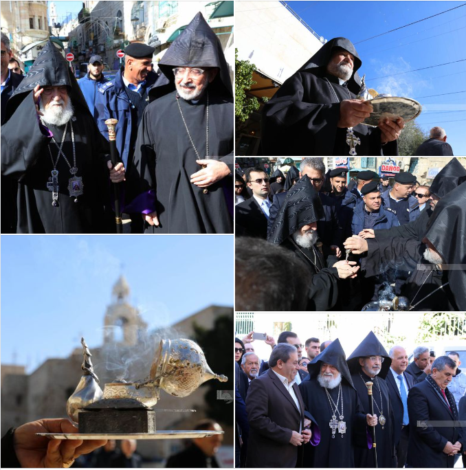 واستقبل الموكب على بلاط ساحة المهد القائم بأعمال محافظ بيت لحم محمد طه، ورئيس بلدية بيت لحم أنطون سلمان، ومدير عام شرطة محافظة بيت لحم العميد حقوقي محمد أبو الرب، وقائد بيت لحم العميد ناضر عمر، ورجال دين ووجهاء الطائفة.