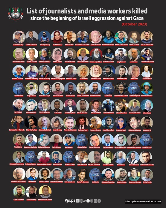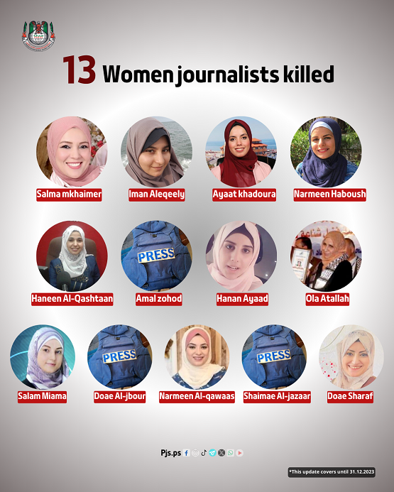 وبينت الإحصاءات التي وردت في التقرير أنه استشهد 102 صحفيا، بفعل القصف الاسرائيلي على منازل الزملاء ومكاتبهم أو اثناء عملهم في الميدان في التغطية الإعلامية، مشيرا إلى أنه من بين الشهداء 13 زميلة صحفية، ومعظمهن يعملن كمراسلات وكالات ومواقع إعلامية، ومنهم 78 عاملا في المهنة الإعلامية، و24 ممن يعملون في مؤسسات إعلامية في شؤون غير إعلامية، إضافة إلى استشهاد عدد كبير جدا من أهالي الصحفيين نتيجة استهداف أبنائهم.