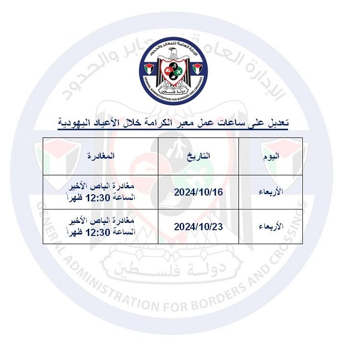 أريحا 13-10-2024 وفا- أعلنت الإدارة العامة للمعابر والحدود، عن إجراء تعديل على ساعات عمل معبر الكرامة يومي الأربعاء 16 و23 تشرين الأول الجاري، بسبب الأعياد اليهودية.