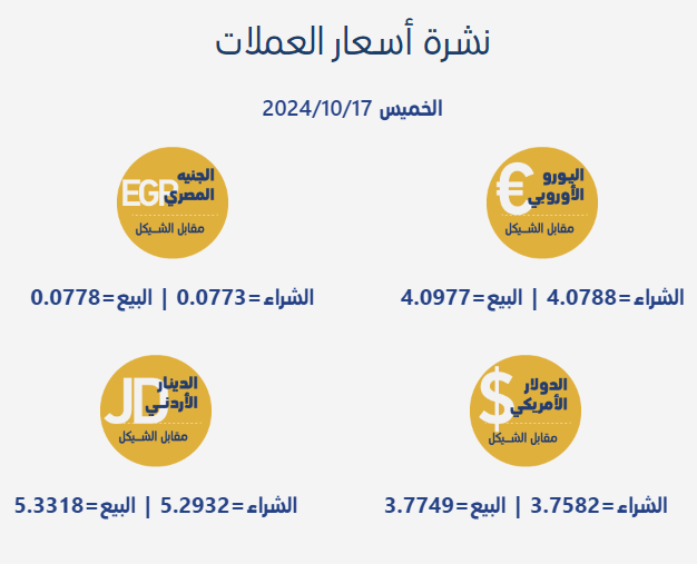 رام الله 17-10-2024 وفا- جاءت أسعار صرف العملات مقابل الشيقل الإسرائيلي، اليوم الخميس، بحسب سلطة النقد الفلسطينية، على النحو التالي: