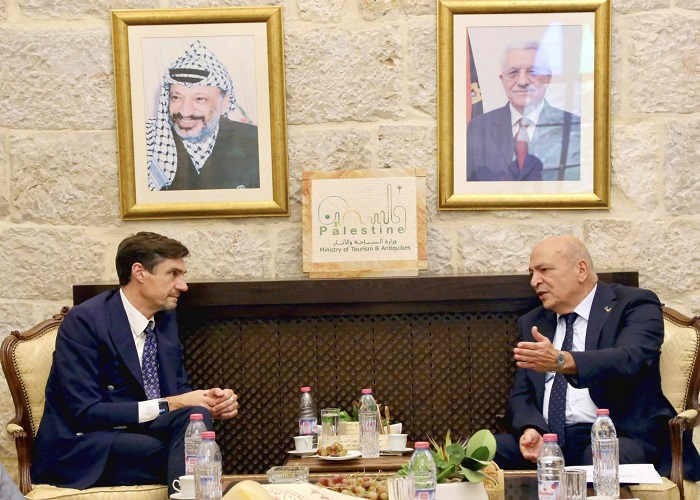 بيت لحم 17-10-2024 وفا- بحث وزير السياحة والآثار هاني الحايك وممثل الاتحاد الأوروبي لدى فلسطين ألكسندر شتوتسمان، اليوم الخميس، سبل تعزيز التعاون الثنائي في مجال حماية التراث الثقافي، والسياحة.